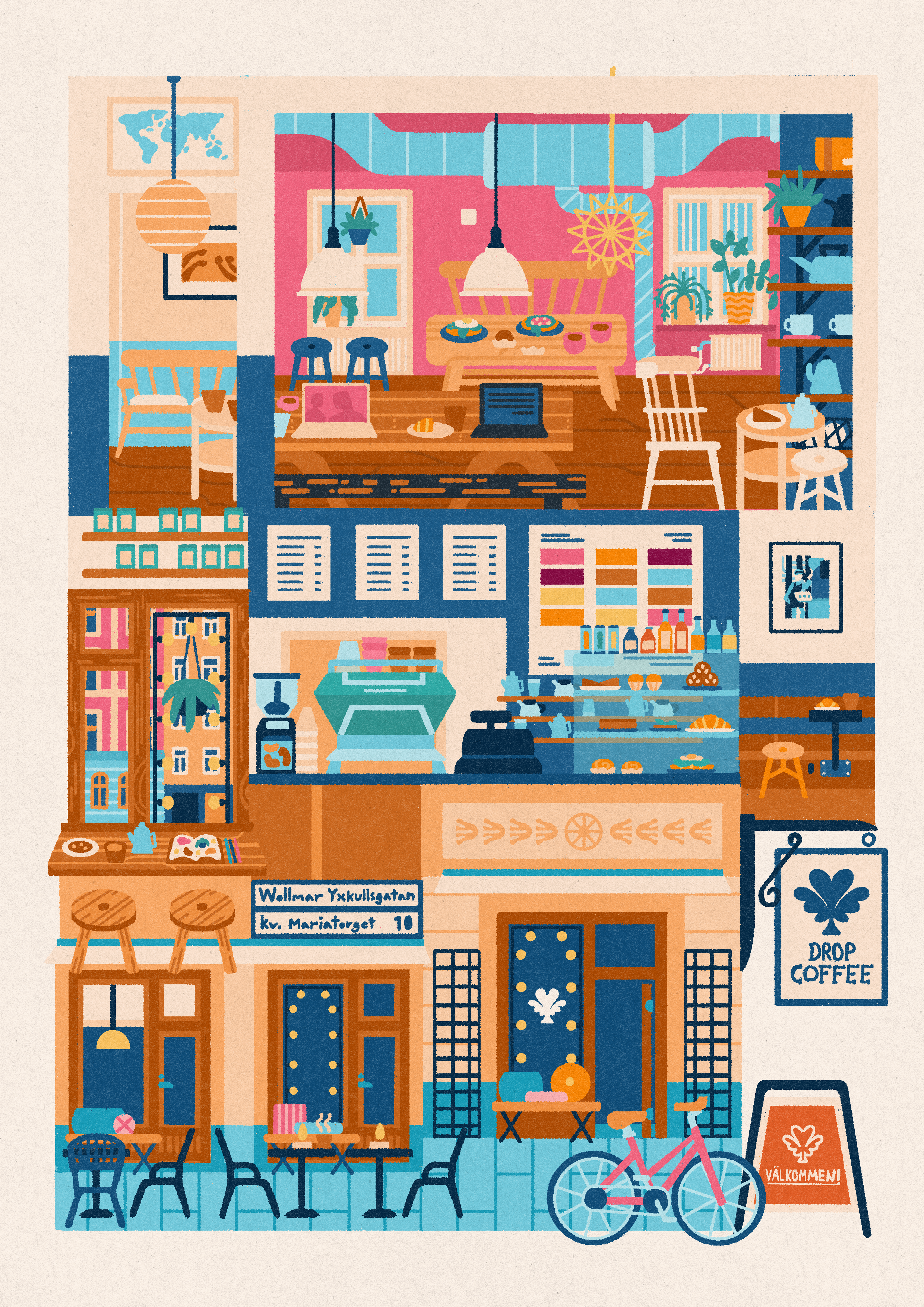 Illustration that depicts the exterior and interior of Drop Coffee’s cafe in Södermalm, Stockholm – meant to capture the cozy ambience and atmosphere.