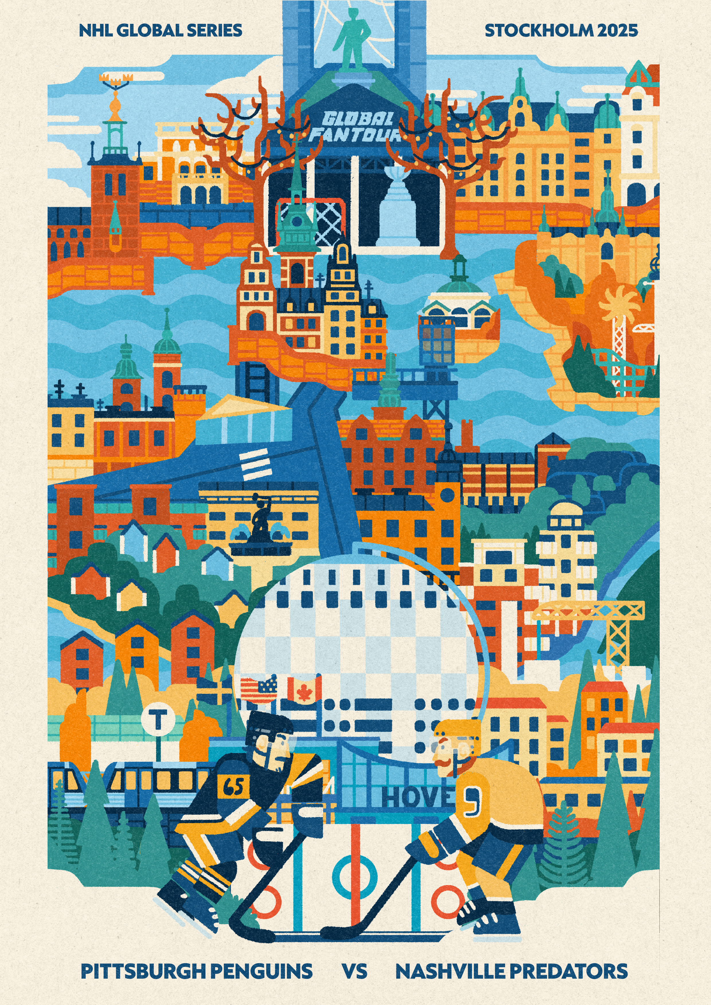Poster illustration meant to promote the NHL Global Series event focused on Stockholm as a city and where the games take place.